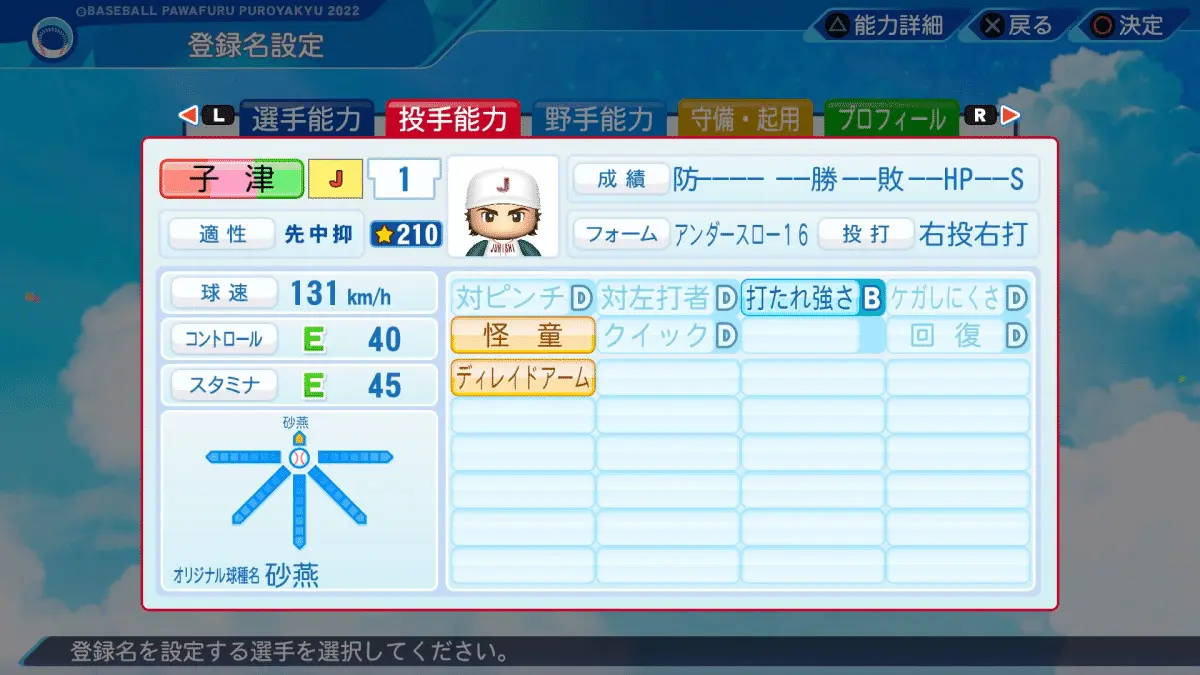 作品全体として投手の守備機会が描写されることは少ないため選手のスペックベースで全体的に低めに設定。