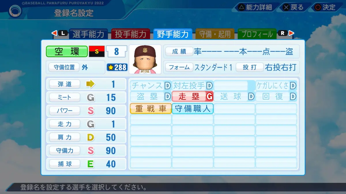 | 評価 | 打力 :??? 守備力:??? 走力 :??? 持久力:??? ※公式プロフィールのグラフなし グラフを突き抜けているものをMAX7.0 グラフの枠最大を5.0としている |